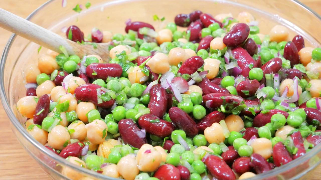 Rinse the beans well and pour them into the dressing along with the frozen peas.