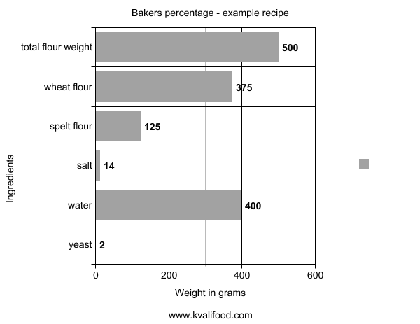 flour %: (375 g / 500 g) * 100 = 75% wheat flour compared to total flour