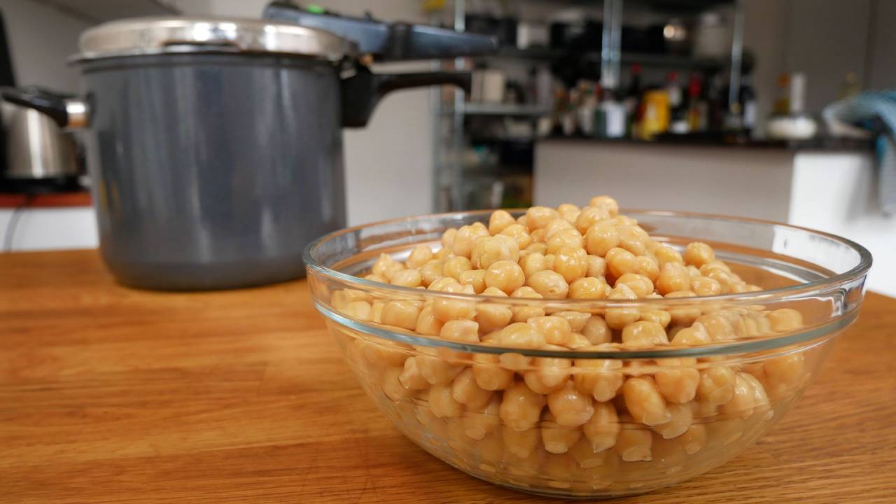 Chickpeas are cheap, healthy and can be used for a myriad of dishes. Unfortunately, they have to be soaked many hours before they can be cooked. Who of us remember to do that? So it usually ends with canned chickpeas, or with something else entirely. Fortunately, you can cook them in under an hour with a pressure cooker.