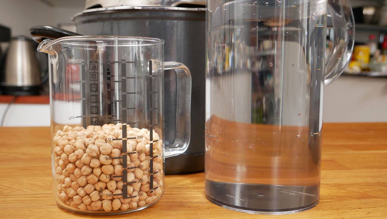 The basic principle when you have to find out how much water is needed in the pressure cooker, is 1 part chickpeas for 2 parts water, so there is enough for the chickpeas. And then approx. ½ liter of water for the pot, so that it does not boil dry.
