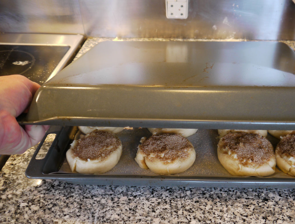 I covered these rolls with a tall roasting pan for the first ten minutes of baking, and then I baked them without a roasting pan for ten minutes more. That makes them raise better in the oven, and they become more airy.