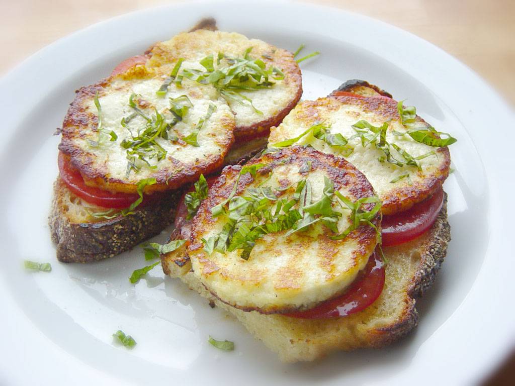 Fried ricotta on toast and tomatoes. - Max M Rasmussen
