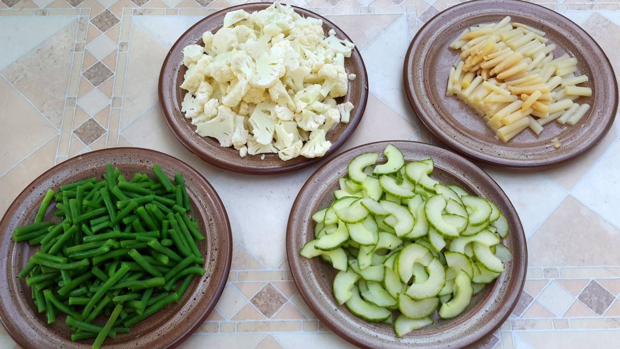If you do not use canned vegetables, boil them for 3-6 minutes in salted water. Let them cool.