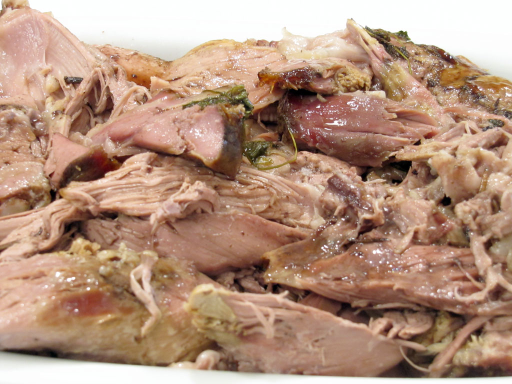 It was placed in the oven at night and was left overnight. When it was finished, it was separated from the bone with a fork and put into a bowl with the juices from the bottom of the pan. Then it was ready to be warmed up in the evening when it was to be eaten.
