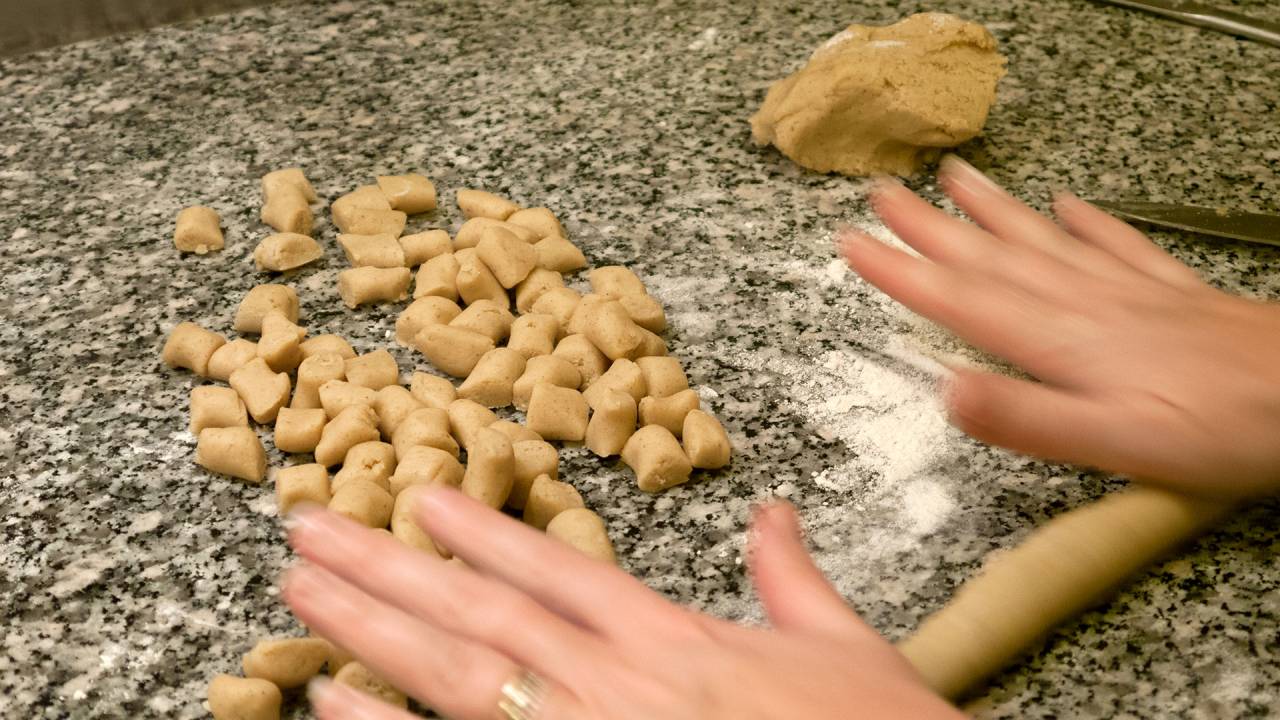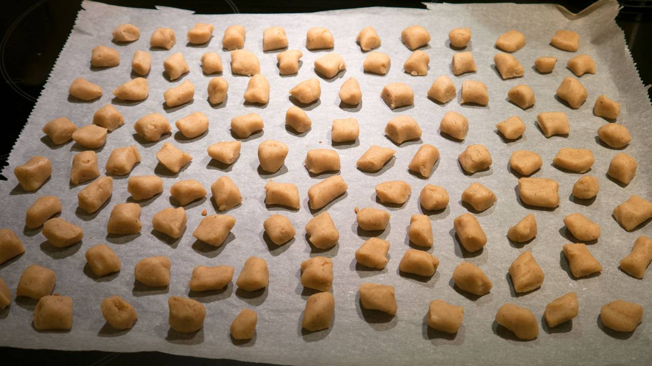 Roll each portion into a long thin roll. Approximately 1 cm (½ inch) thick. Cut them out in pieces of ½-1 cm (1/4 inch -1/2 inch). They should be smaller than you think.