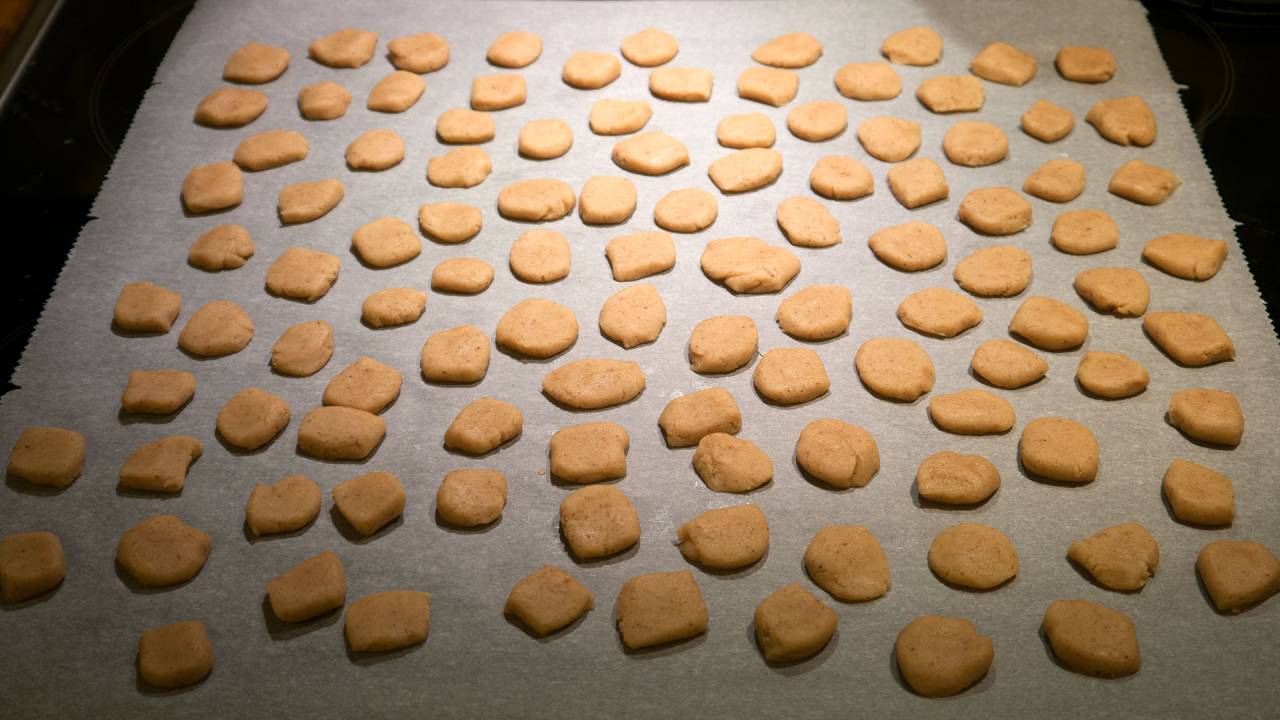 Put the pieces onto baking paper on a baking pan.