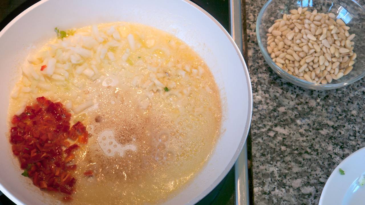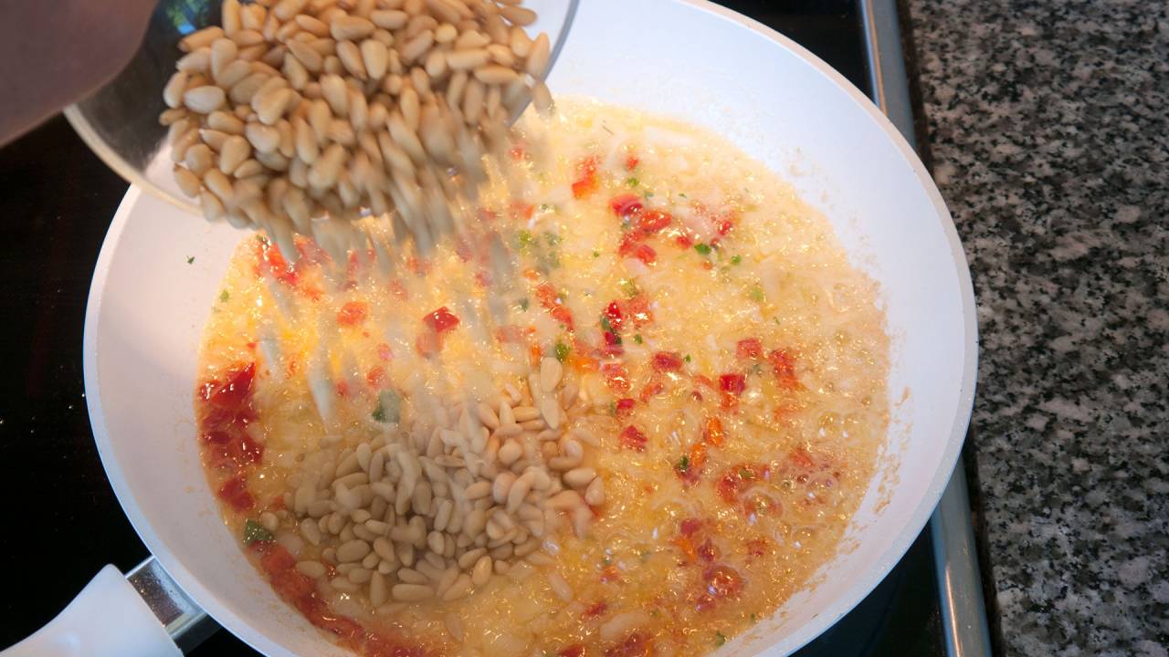Add the pine kernels and toast them lightly. They should not be black.
