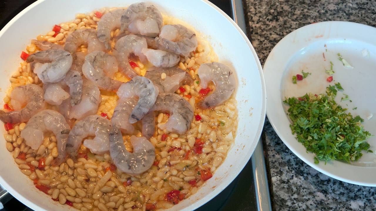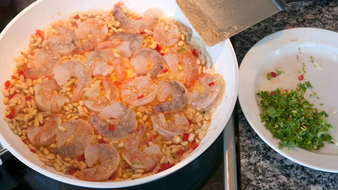 Add the prawns and let them cook pink. Turn them as few times as possible. Preferably, only 1 time.