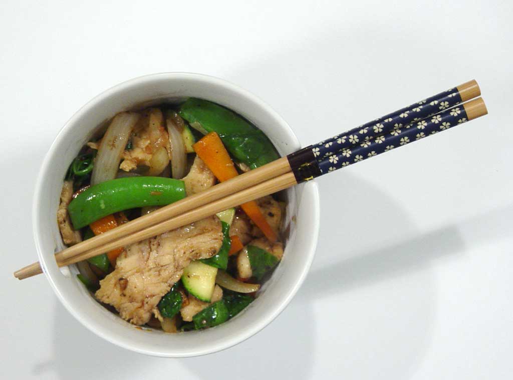 Stir-Fry is also eaten with chopsticks. This has an impact on how you cut and prepare the ingredients. They must be small enough that you can put them in your mouth directly. There is no knife on the table to cut them with. But they must also be large enough that you can hold them with two sticks.