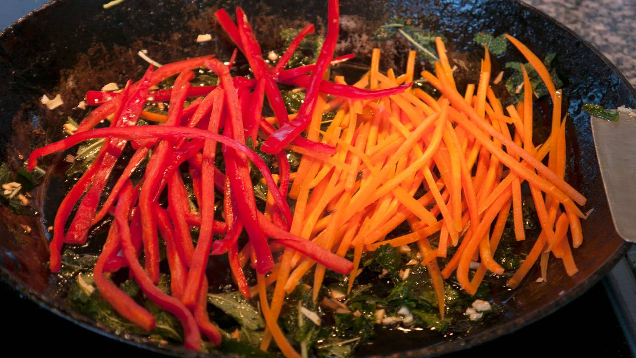 Once all the vegetables are roughly equally soft and pliable The dish is finished. It should take approx. 10 minutes in total from the start. The vegetables are not supposed to be browned. They should be slightly al dente.