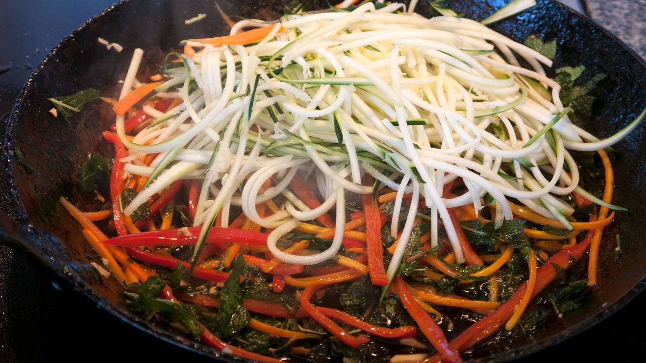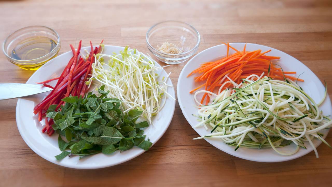 Cut the vegetables into strips very thin strips. It is easiest with a julienne tool. It is more fun the longer they are, but length is not an absolute requirement. If you don't have a julienne tool I have an article and video about knife handling that might help.