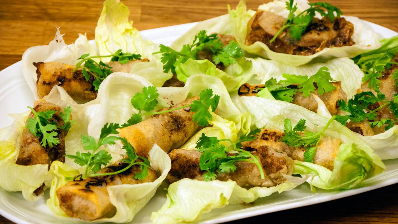 Serve with lettuce leaves cut in half. They should be folded around the roll along with some fresh coriander. It is of course optional, but much better than just eating the rolls.